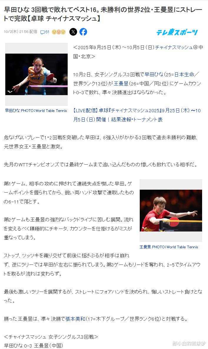 日本媒体《东京体育网》写道:早田希娜面对世界排名第二的王曼昱选手完败,最终止步16强。