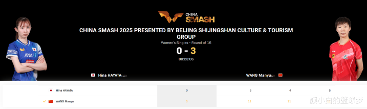 北京时间10月3日,WTT北京大满贯女单1/8决赛,国乒选手王曼昱3-0横扫日乒选手早田希娜晋级八强,三局比分:【11-6,11-4,11-5】。换言之这场比赛早田希娜对王曼昱没有任何的阻碍,王曼昱赢得非常轻松。